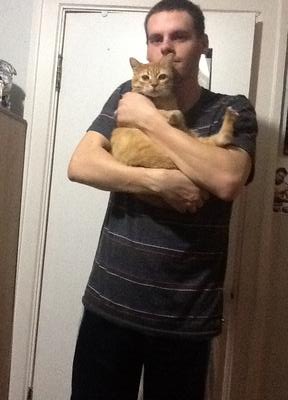The very first time I ever laid eyes on him he really stood out from all the other kittens He had just finished eating spaghetti. He was just five weeks old. Called him over. And it was love at first sight. He already had his name and covered in sauce he looked like the cartoon Garfield I just had to keep his name . I overheard his owner say she couldn't afford to keep them all so I was with my dad and I told him I want him he's perfect and he said ok well call your mom and see if its ok with her. So I did and she said that it was fine so my dad convinced his friend the owner and they said it was alright and that I could have him. That was when I was 20 going on 21 and this July that was 7 years ago and I don't have any kids of my own with my wife yet so Garfield and our other younger cat Oreo are our kids and I'm proud of them.