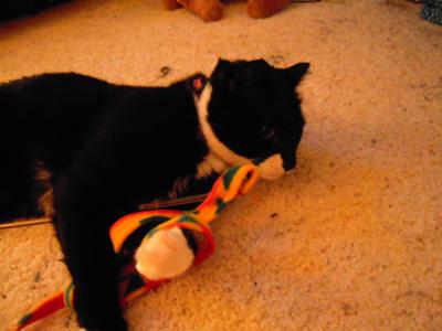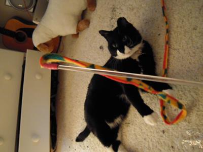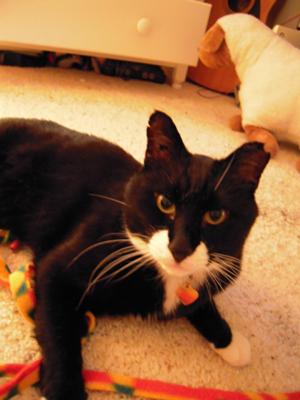 I was wrong. My family moved yet again. My mother happened by a humane society just for the heck of it. She looked around and saw a bunch of new arrivals. She spotted one that might peak my interest. I went there with her, only to see a beautiful tuxedo cat, fighting for his life. He was so worn he could barely lift his head. His paws and ears were covered in bandages, laying on his side with a pack on his left leg, with a breathing mask on. He was the one. The ladies recommended I find a different cat to adopt because they feared he would not live. I was determined, my mom knew, we both knew. My mom went there everyday when I was in school to check on him. Sure enough he got better. The ladies still insisted that we find another cat. They were not sure if the frost bite on his paws to need amputation. We believed he would make it. They ladies informed us of his background, that he was a ferral cat found near dead in a snow bank, with his nose frozen to the pavement, his tale was broken from an accident long before and was never properly set, he has chips in his ears, scratches and scars from fighting, his left leg was periodically sore possibly from another injury. He healed, and he became familiar with our faces. The ladies were still concerned that since he was ferral it would not work out. We took him home and loved him. He loves us back. He is the best cat, he seems grateful for having a warm roof over his head, toys, and food. It was obvious he was ferral before hand because he was not sure how to act around people but he seemed like he wanted to since they saved him. Every christmas he is the most excited one in the entire house, and that includes my nieces and nephews. He love to sleep under the christmas tree, and he loves getting a christmas stocking every year. He waits patiently as we open our gifts and then open his. He plays with every toy as if each one is more special then the last. I have not seen a cat act so grateful for all he has. He keeps my moms feet warm when she is sick, he keeps my dad company in the morning, and he is always there when I need him. Franky is his name, named after a once great cat...given to another great cat. He was a popular little mascot for my college class. At lunch time we could leave the school and play with him to get the stress out. He is still a fighter and a big bad alley cat when hes out side, but with us he is a big marshmellow of love. I believe in my heart that tuxedo cats are special cats. Something about their fancy wrappings is a sign that they need special attention by humans. They are no ordinary cat. They are dressed to impress for a reason, let one into your life and you will see how impressive they truly are.