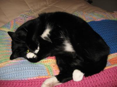 It was Christmas Eve in Las Vegas Nevada about 10 years ago, and my wife, Karen, was walking along a sidewalk in our neighborhood, looking at the lights. She heard a cat meowing nearby. She turned around and saw a roughly six month old tuxedo cat walking behind her. We already had two fixed male tabby cats, Frankie and Sammy, but this one was heading right toward Karen, using her "tuxedo pretty kitty" wiles. Karen called me on her cell phone: "I got a little kitty," which after some examination we found out was female. Of course we called her Noel.
