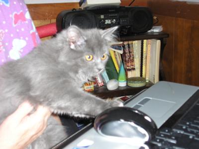 Shasta on Mama's lap, Surfin' the Web! (Wonder if she's checking out Cat-lovers-gifts-guide.com?)